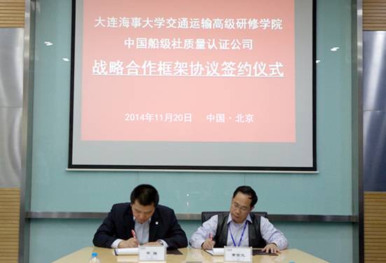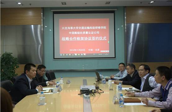 11月20日大连海事大学交通运输高级研修学院与中国船级社质量认证公司(CCSC)于中国船级社认证公司总部签署战略合作框架协议。双方就共同开展管理体系内审员培训、国家注册审核员培训及企业安全生产标准化达标评审自评员培训等达成了共识。